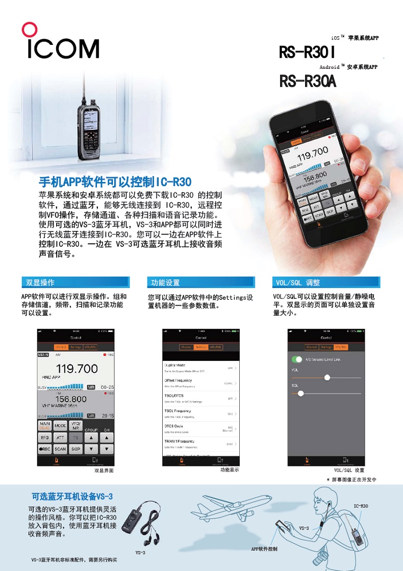 蘋果系統(tǒng)和安卓系統(tǒng)都可以免費(fèi)下載IC-R30的控制軟件,通過藍(lán)牙,能夠無線連接到IC-R30,遠(yuǎn)程控制VFO操作,存儲(chǔ)通道 各種掃描和語音記錄功能。使用可選的VS-3藍(lán)牙耳機(jī),VS-3APP都可以同時(shí)進(jìn)行無線藍(lán)牙連接到IC-R30.您可以一邊在APP上控制IC-R30.一邊在VS-3可選藍(lán)牙耳機(jī)上接收音頻聲音信號(hào)。