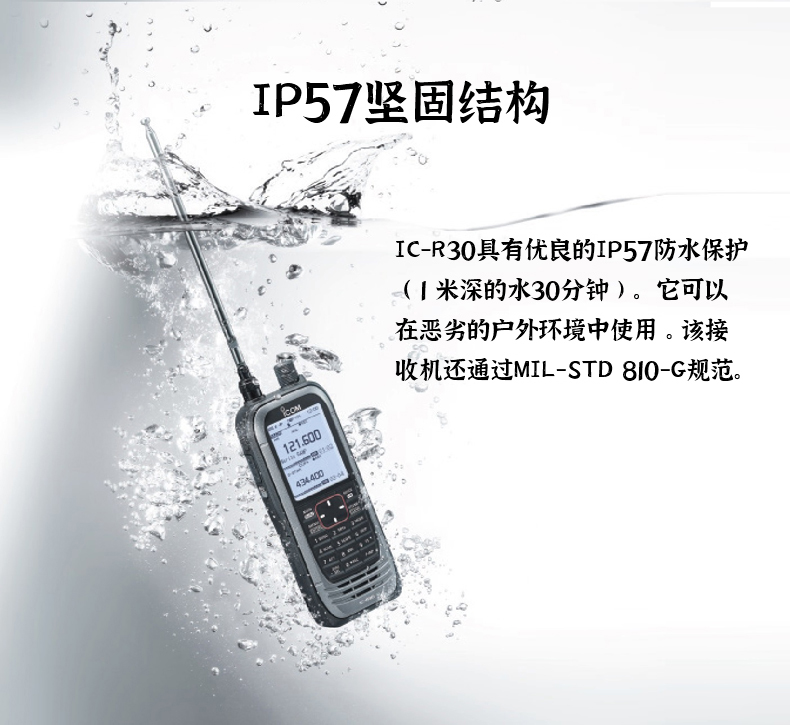 IP57堅(jiān)固結(jié)構(gòu)  IC-R30具有優(yōu)良的IP57防水保護(hù)(1米深的水30分鐘)。它可以在惡劣的戶外環(huán)境中使用。該接收機(jī)還通過MIL-STD 810-G規(guī)范