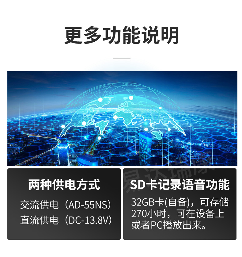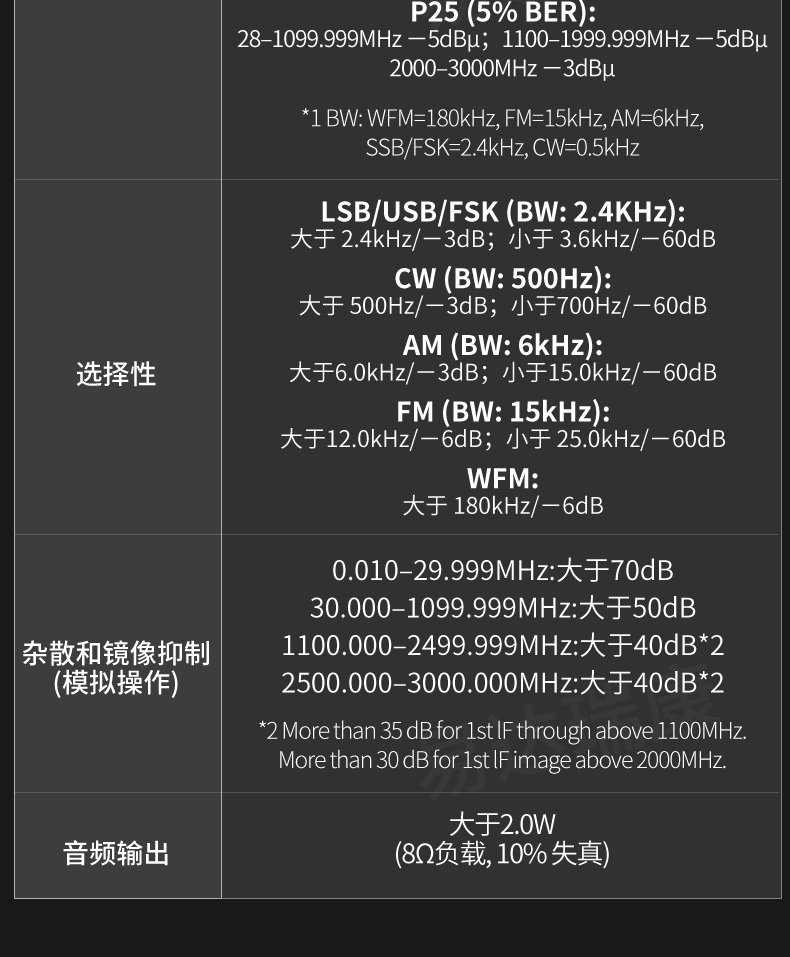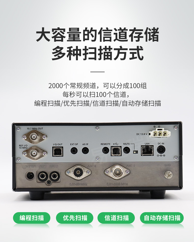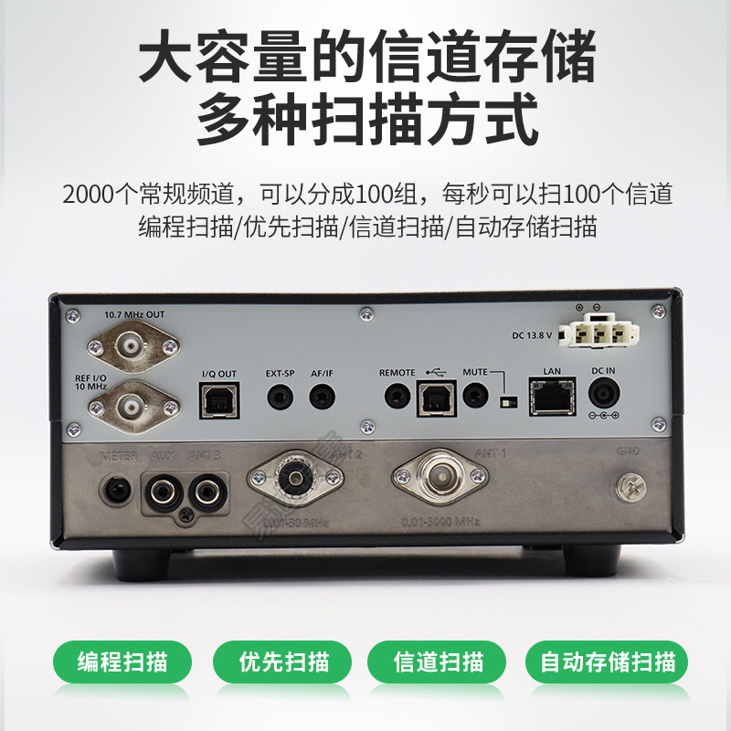 10KHz-3GHz寬頻段接收,4.3英寸彩色觸摸屏。兩種電源接入方式,2個天線端口。支持D-STAR, NXDN,dPMR,APCO ,P25模式。可顯示接收到信號的強(qiáng)度。