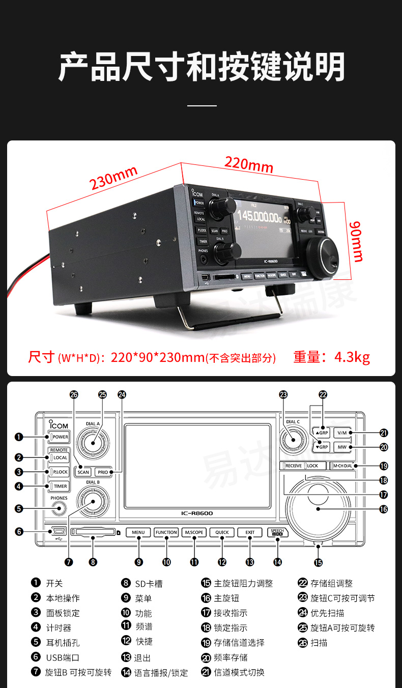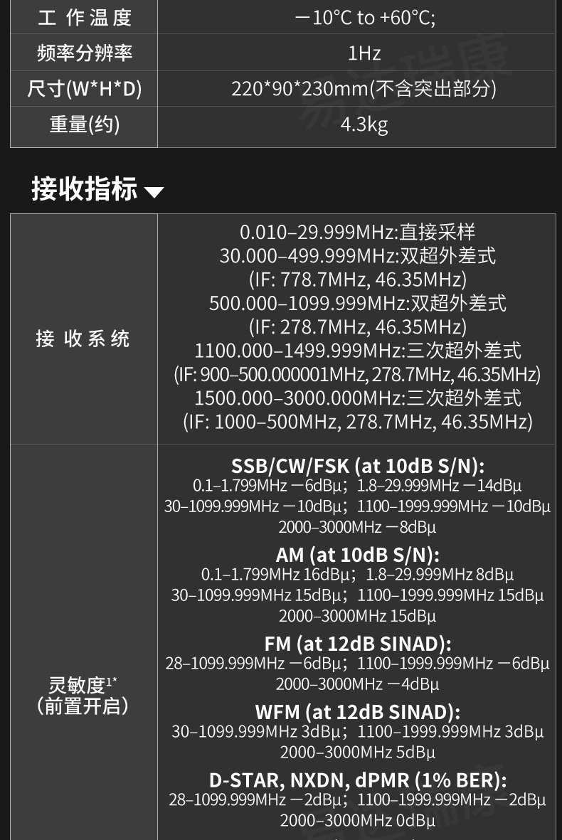 • 10KHz-3GHz寬頻段接收,4.3英寸彩色觸摸屏。