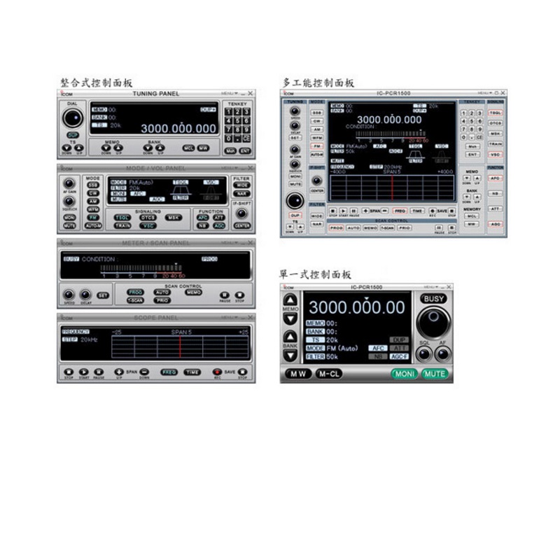 超寬頻率范圍 存儲頻道: 電腦連接方式:USB線 雙頻段顯示功能,優選接收功能 數字信號接收功能(只限于IC-PCR2500) 可選3種揚聲器(主機揚聲器,電腦揚聲器,外接揚聲器)