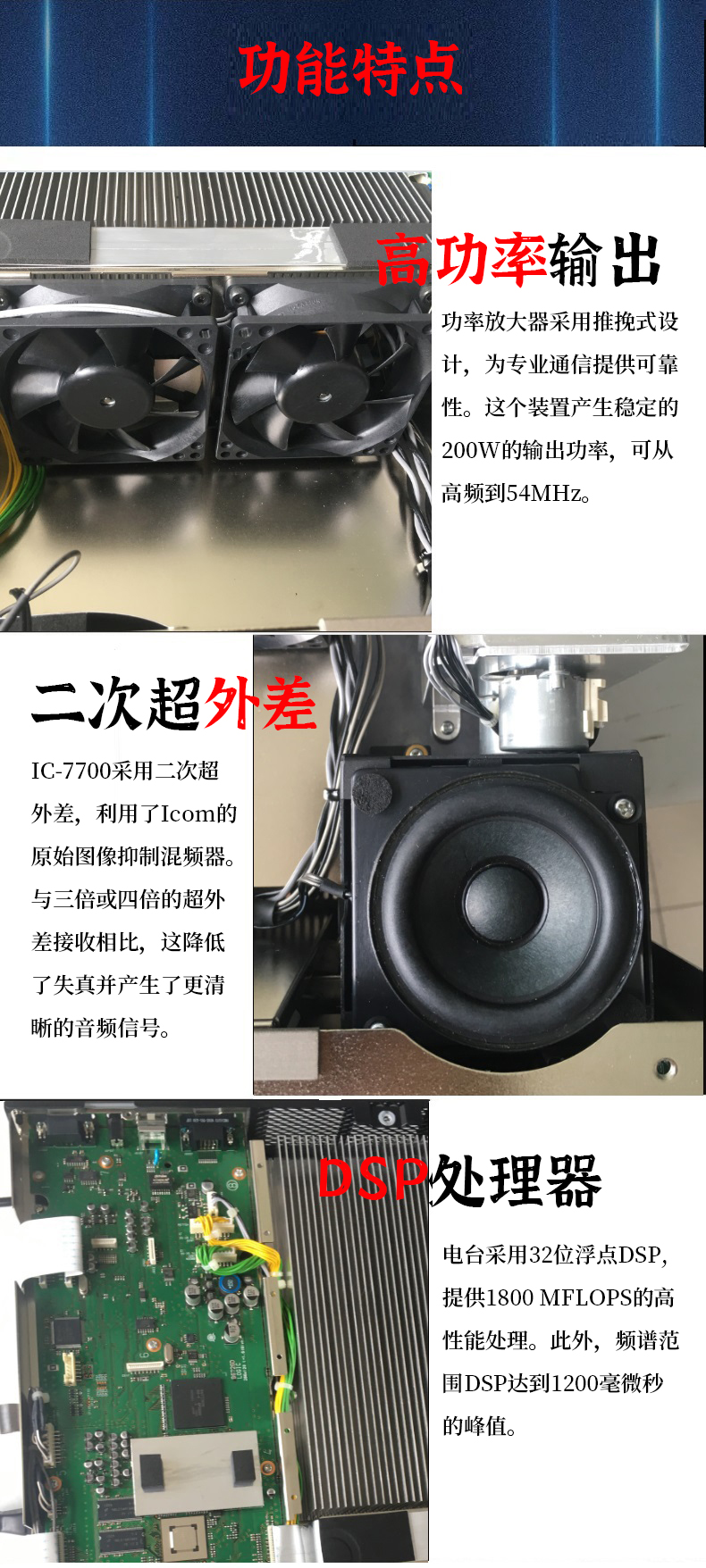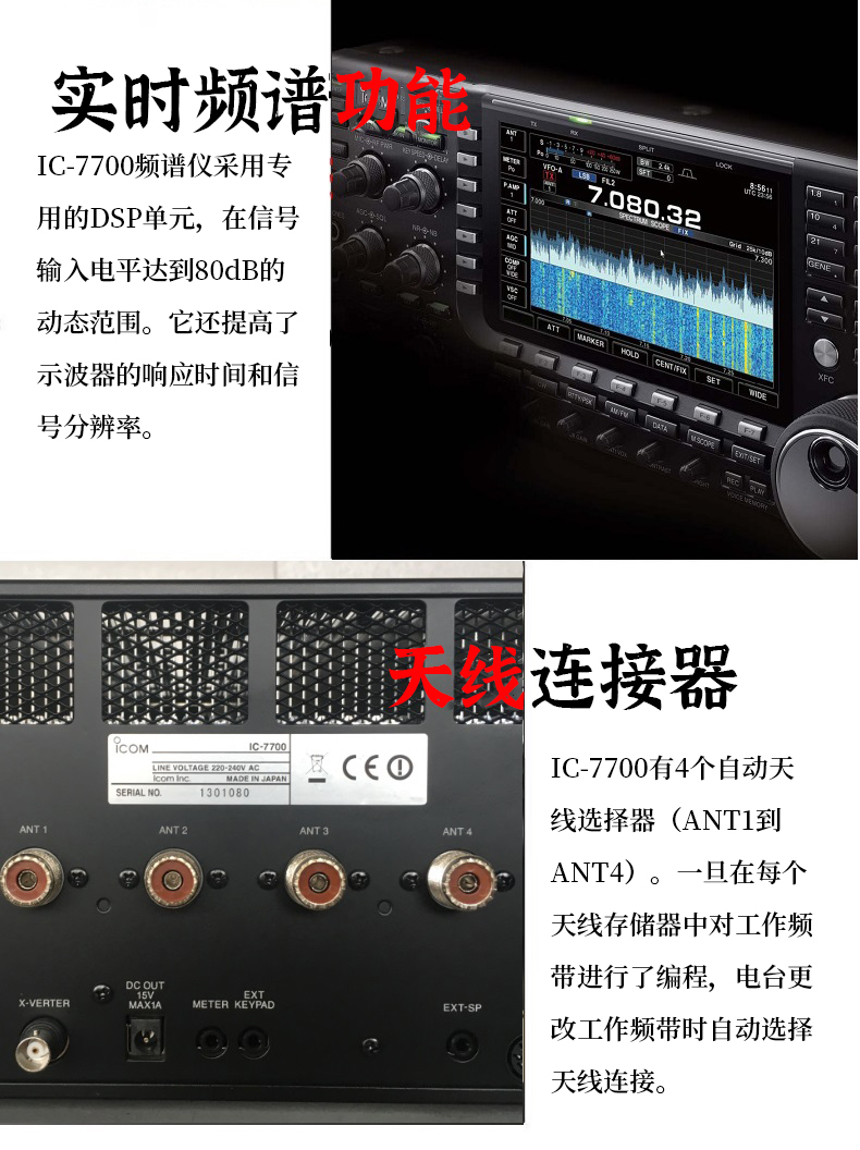 電臺有4個天線接口,針對不同頻率連接不同天線。 內置的dspC處理單元,提供高性能的頻譜顯示和信號處理。 散熱性能良好,保證200W大功率輸出。