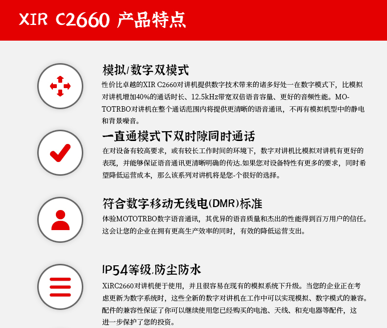 性價比卓越的XIR C2660對講機提供數字技術帶來的諸多好處一在數字模式下,比模擬對講機增加40%的通話時長、12.5kHz帶寬雙倍語音容量、 更好的音頻性能。MOTOTRBO對講機在整個通話范圍內將提供更清晰的語音通訊,不再有模擬機型中的靜電和背景噪音。