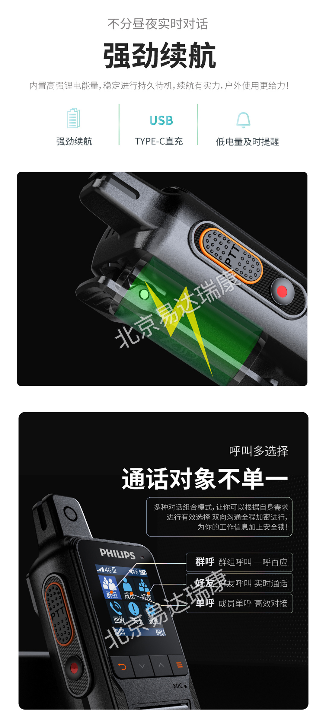 雙卡雙待/全國/公網對講/云端錄音/智慧平臺高效管理/快捷PTT呼叫/強勁續航/TYPE-C直充/可拆卸電池/
