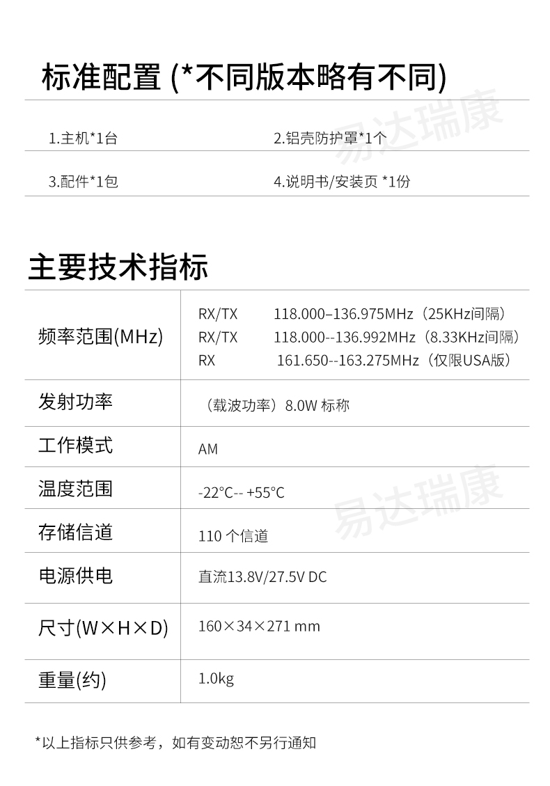 • 50個(gè)記憶信道,ANL自動(dòng)降低噪音功能,一鍵121.5MHz信道。